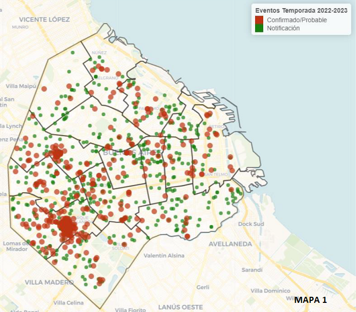 El Mapa 2, de la misma fuente, muestra concentración de casos notificados y confirmados/probable de dengue por georreferenciación para la Temporada 2022/23. En él se verifica el conglomerado de casos en las Comunas 9 y 11