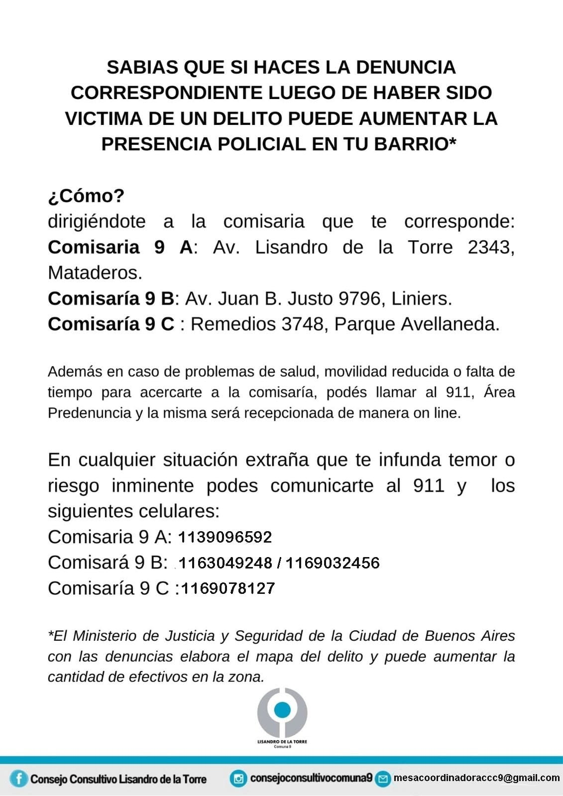Una cuestión que se ha reiterado a lo largo de las reuniones es la necesidad de que los vecinos denuncien luego de haber sido víctima de un delito. Por eso el Consejo Consultivo Comunal 9, en su reunión del 26 de junio pasado, decidió acompañar la campaña emprendida por vecinos para informar y promover esas denuncias.